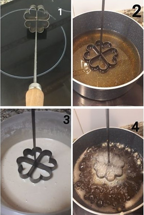 Cuando la floreta se suelta del molde, hay que dejar el molde metido en aceite caliente. Sólo se saca de la sartén para mojar en la masa.